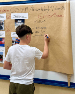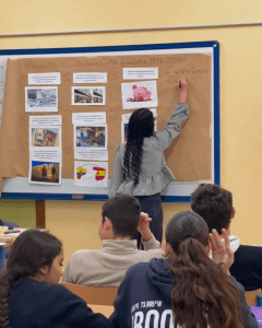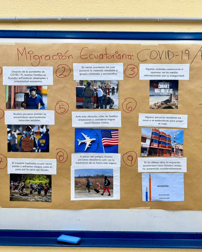 Sesión de trabajo con el alumnado del IES Trassierra centrada en la comprensión de las migraciones desde una perspectiva global. A través del análisis del caso de Ecuador en dos momentos históricos recientes, el alumnado reflexiona sobre las causas estructurales que impulsan la migración y cuestiona los estereotipos asociados. Las imágenes muestran el proceso de investigación, diálogo y pensamiento crítico desarrollado en el aula.